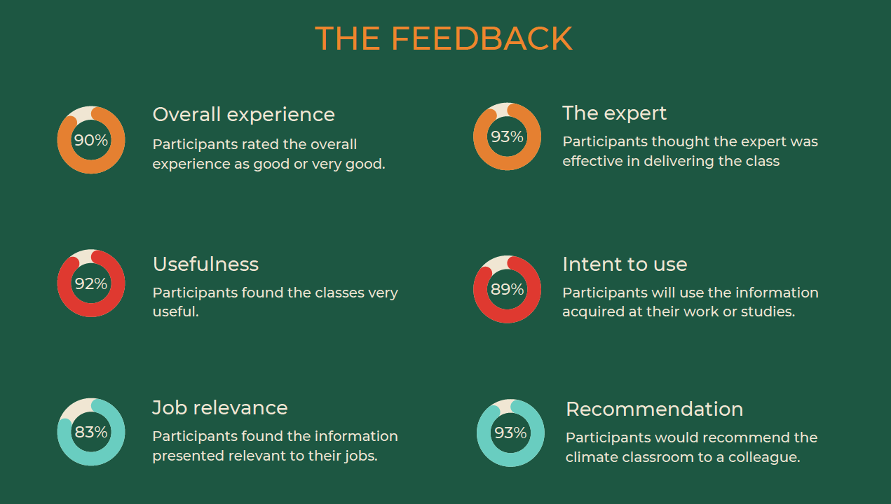 Une fois de plus, les Classes sur le climat ont constitué une ressource utile et enrichissante pour les participants qui assistaient et suivaient les négociations sur le climat. Dans l’ensemble, les participants ont largement apprécié l’édition de cette année : 90 % des personnes interrogées dans le cadre d’un sondage l’ont jugée bonne ou très bonne, et 92 % ont trouvé les cours très utiles.